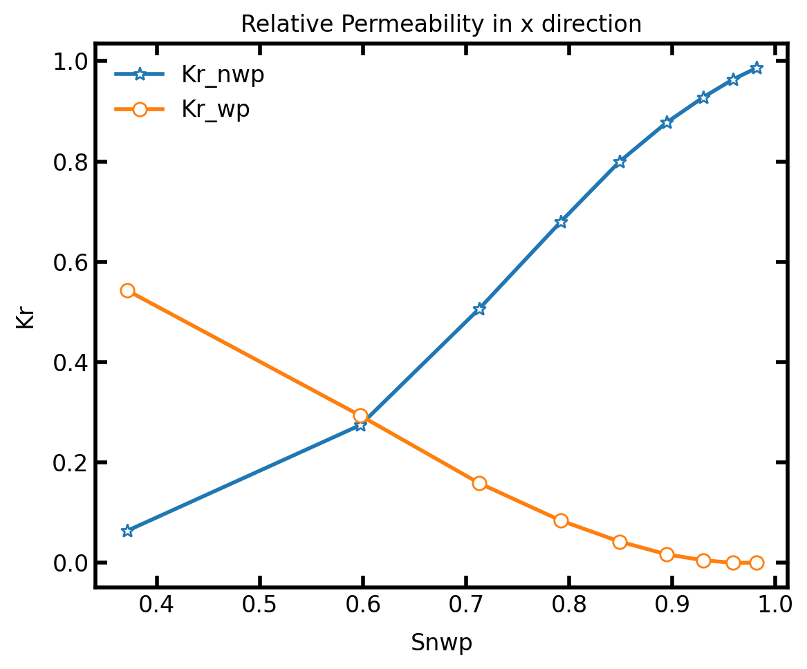 Now that we have defined the required models and functions, we can find the relative permeability of phases over a range of saturation. We selected 10 saturation points. A higher value can be used to obtain a better approximation of the curve.