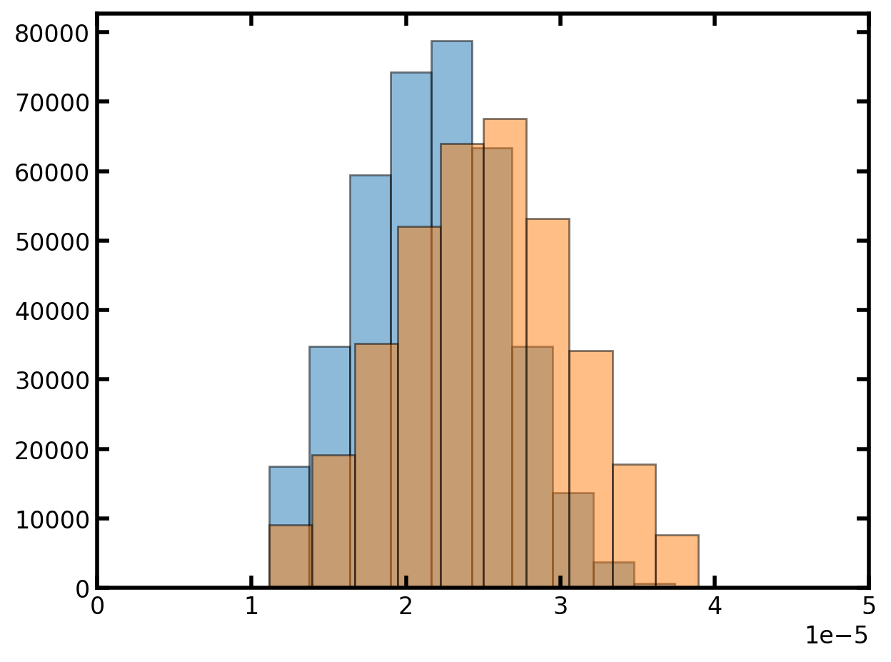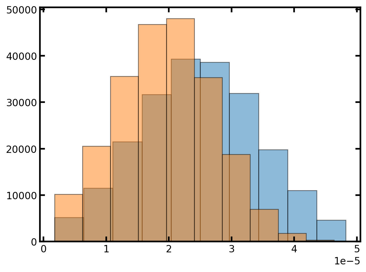plt.hist(pn['throat.diameter'], edgecolor='k', density=True, alpha=0.5)