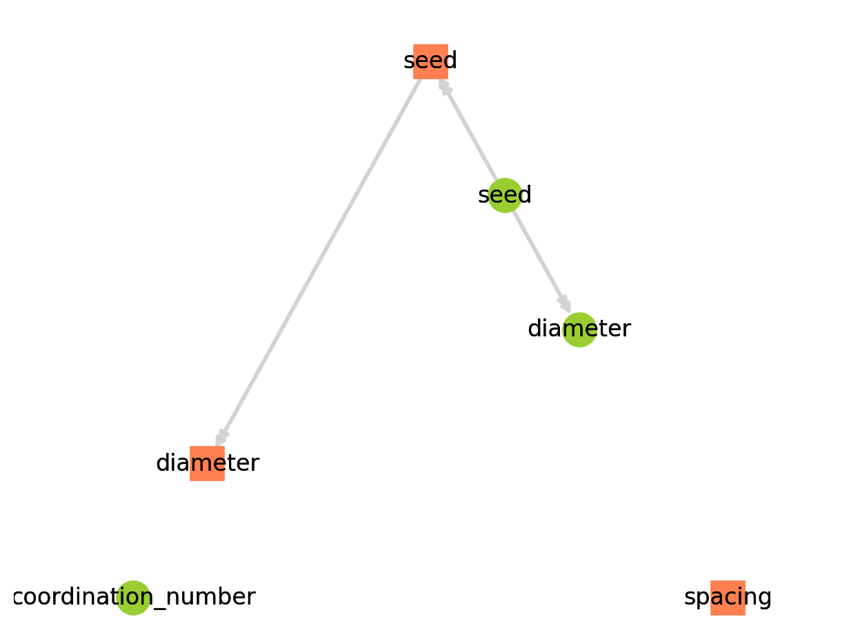 The green circles are pore properties and the orange squares are throat properties. We can also see that there are two models which are not dependent on anything else: 'throat.spacing' and 'pore.coordination_number'. These are added to all networks during generation but not run, hence their values do no show up when doing print(pn).
