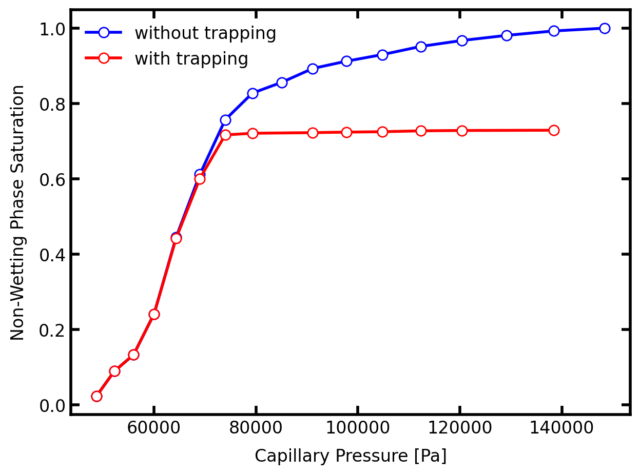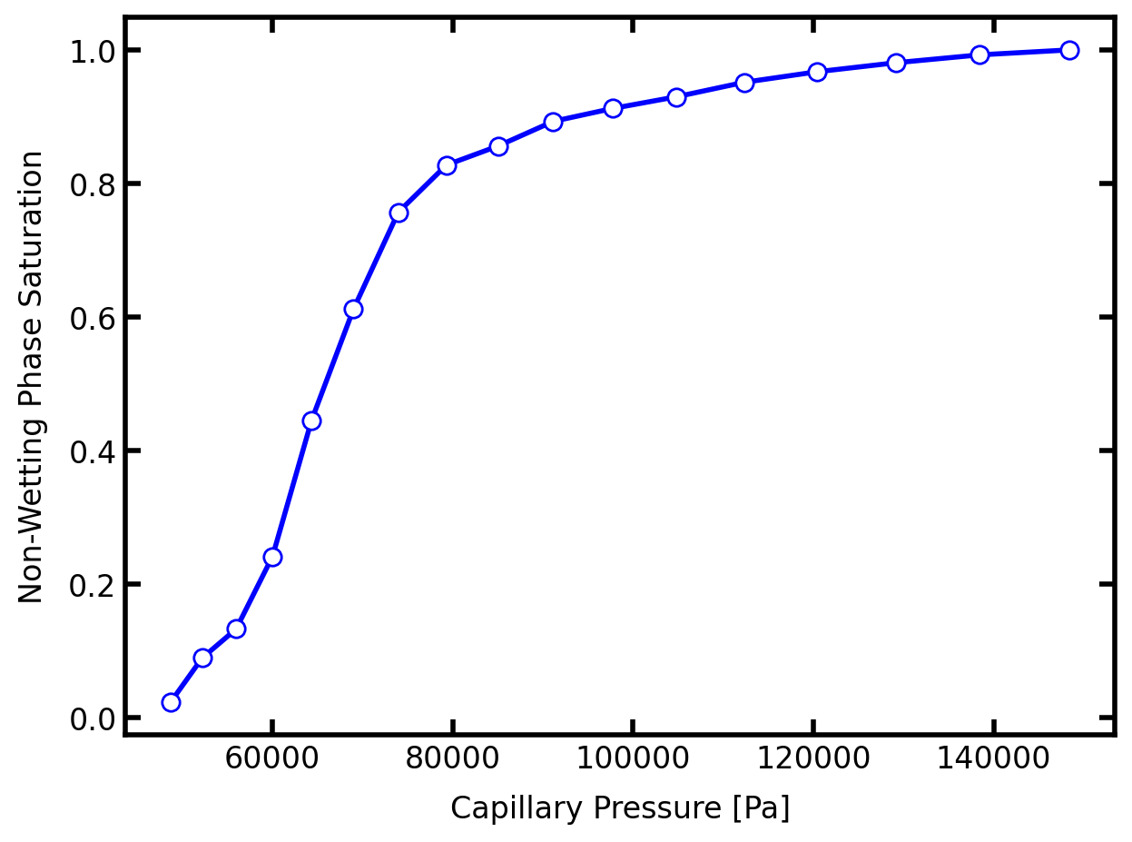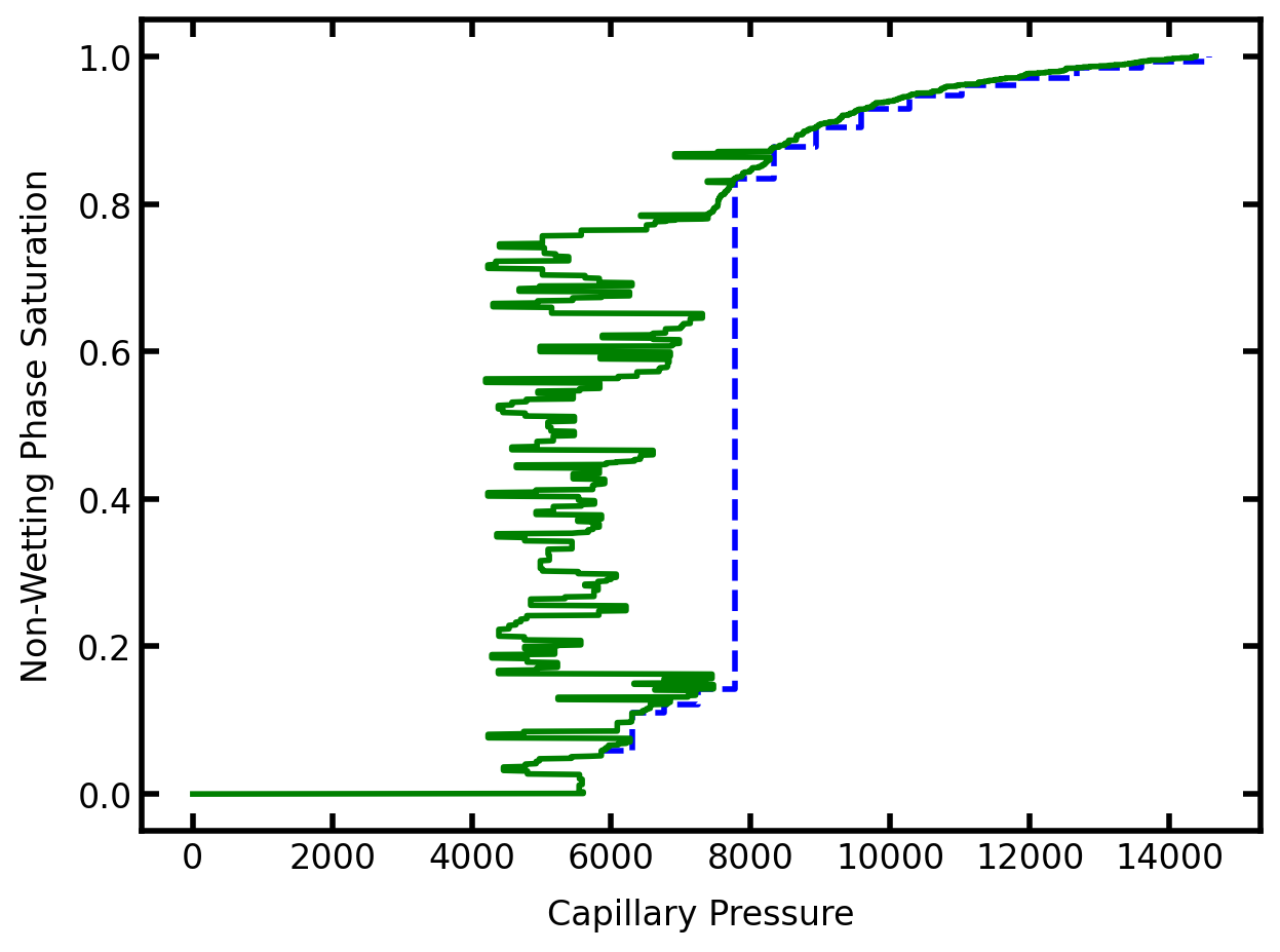 The above process can yield a capillary pressure or drainage curve be repeating for increasingly high values of ‘throat.entry_pressure’ until the entire domain is invaded. This is the process that is used in the Drainage